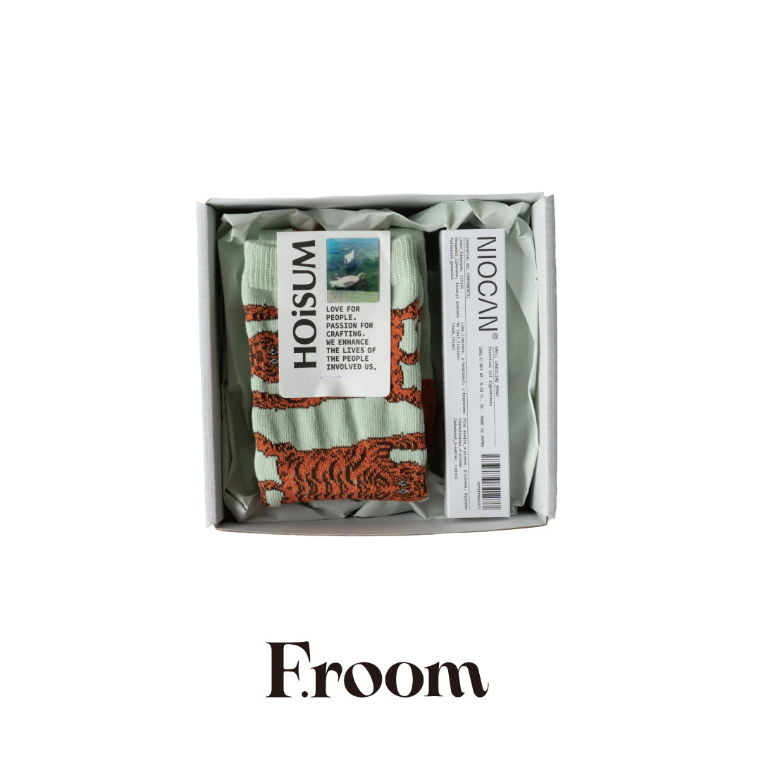 衣食住、どんなニオイも瞬時にリセットできるNIOCANの持ち歩ける携帯用サイズスプレー&履くだけで気分が上がるHOiSUMのデザインソックスがF.roomBOXに入った実用性とデザイン性を両立した限定セット。デイリー使いにぴったりなアイテムで、感謝の気持ちを伝えよう♪